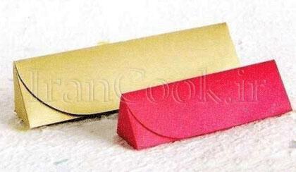در مرکز بخش سبز رنگ پایین ( خطی که صاف کشیده شده است ) برش کوچکی به اندازه زبانه کیف ( زبانه ای که در بخش کرم رنگ بالاست ) ایجاد کنید تا زبانه داخل آن شود و جعبه کادو مانند کیف بسته شود.